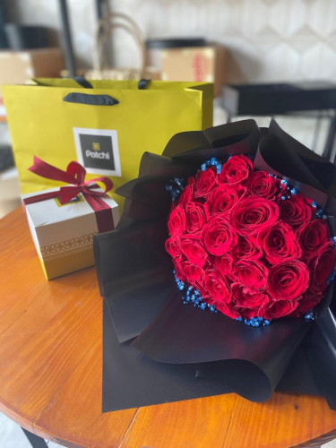 ورد احمر جوري فاخر واقف على قاعدة